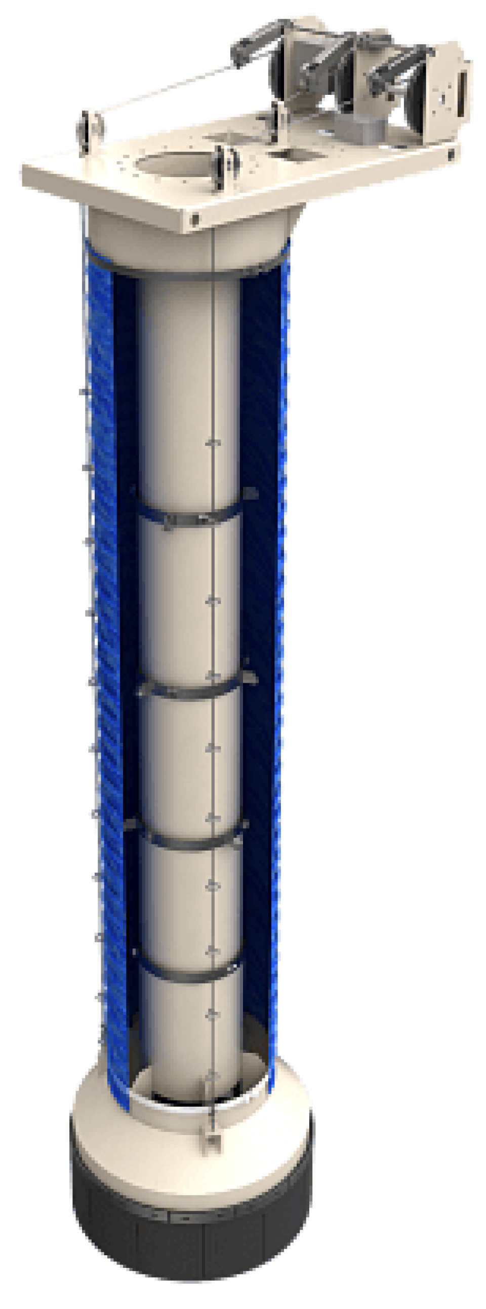 - нижняя часть – пыленепроницаемый колокол, оснащенный резина-тканевыми пластинами, формирующими «юбку», который находится в непрерывном контакте с загружаемым материалом и предотвращает выделение пыли из-под загрузчика. Пыленепроницаемый колокол оснащается датчиками уровня материала, обеспечивающими постепенное поднятие телескопического загрузчика с сохранением постоянного контакта с насыпной кучей материала.