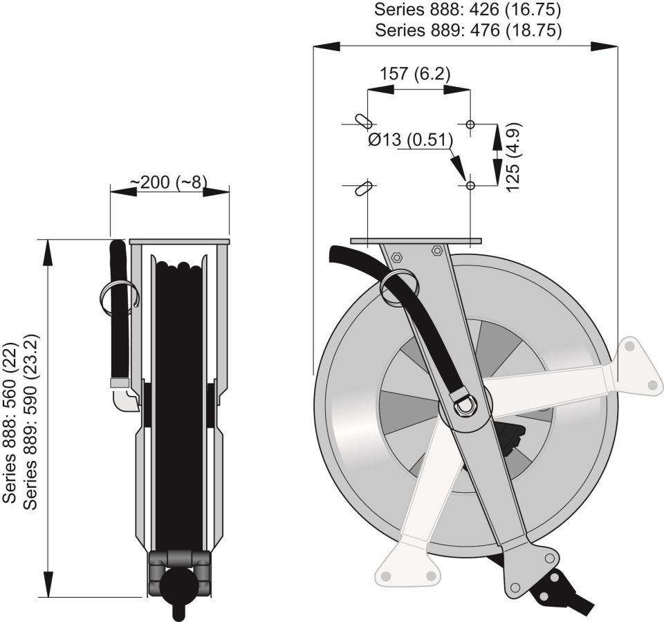 Катушки среднего размера открытой конструкции серии 889 оснащены немного большими по размеру барабанами и, следовательно, могут использоваться для более длинных шлангов, чем в моделях серии 888. Благодаря открытой конструкции, катушки легко обслуживать и держать в чистоте. Можно устанавливать на стене или потолке.