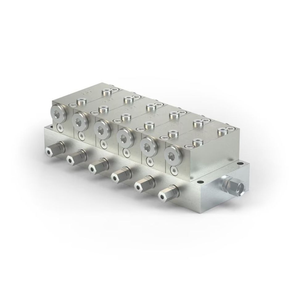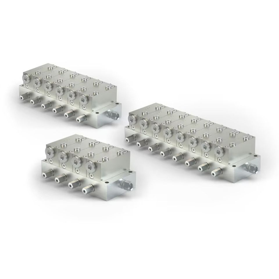 -             Для последовательных или циркуляционных систем смазывания масломPSG3 состоит из опорной панели и различных дозирующих сегментов, которые могут сочетаться друг с другом для создания требуемых соотношений выходов. Каналы являются частью опорной панели, поэтому соединения и трубки остаются на месте при необходимости замены отдельных сегментов. Технические характеристики и преимущества - Простота обслуживания, так как выходы расположены на опорной панели