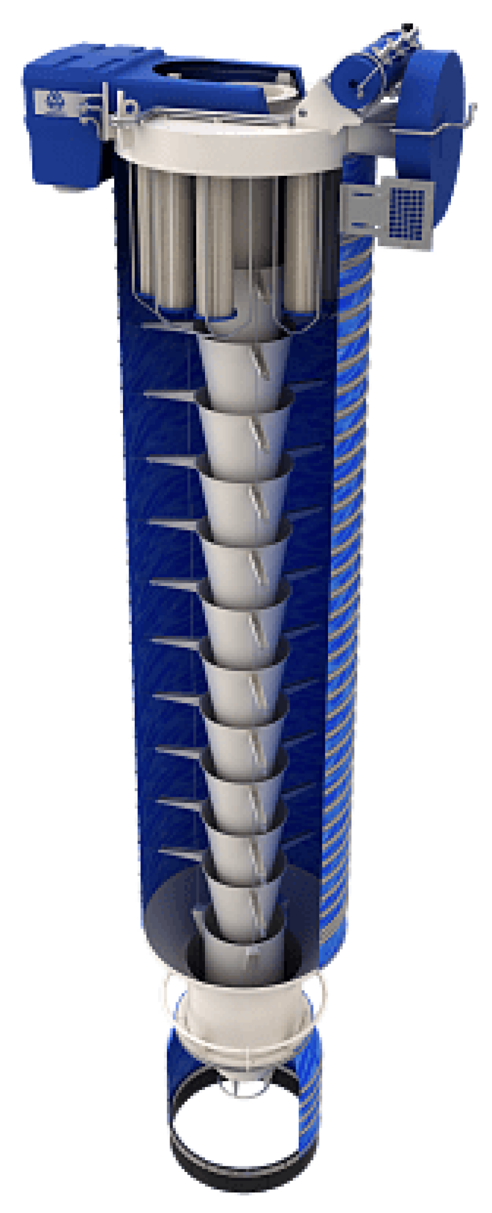 - нижняя часть – уплотнительный конус с полимерным покрытием, который герметично стыкуется с загрузочным люком. Уплотнительный конус оснащен запирающим конусом – закрывает высыпное отверстие загрузочного устройства перед поднятием его в верхнюю позицию и предотвращает попадание частиц пыли в окружающую среду. На запирающем конусе установлен датчик уровня материала, сигнализирующий о заполнении емкости загружаемым материалом. Уплотнительный посадочный конус оснащен пыленепроницаемым колоколом с резина-тканевыми пластинами, формирующими «юбку». Во время открытой загрузки – колокол находится в непрерывном контакте с загружаемым материалом и предотвращает выделение пыли из-под загрузчика. Подъем и опускание пылезащитного колокола осуществляется в ручном режиме.