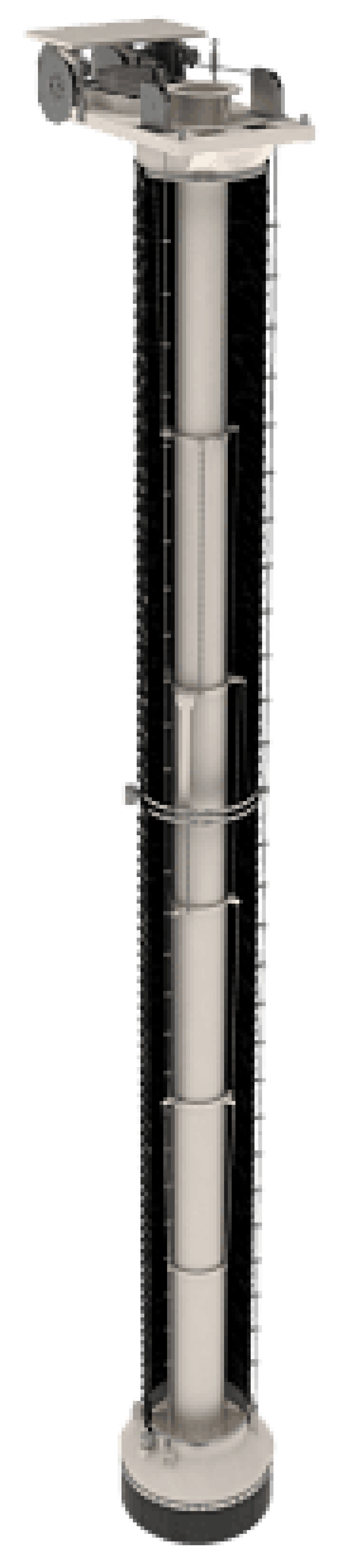 - нижняя часть – пыленепроницаемый колокол, оснащенный резина-тканевыми пластинами, формирующими «юбку», который находится в непрерывном контакте с загружаемым материалом и предотвращает выделение пыли из-под загрузчика. Пыленепроницаемый колокол оснащается датчиками уровня материала, обеспечивающими постепенное поднятие телескопического загрузчика с сохранением постоянного контакта с насыпной кучей материала.