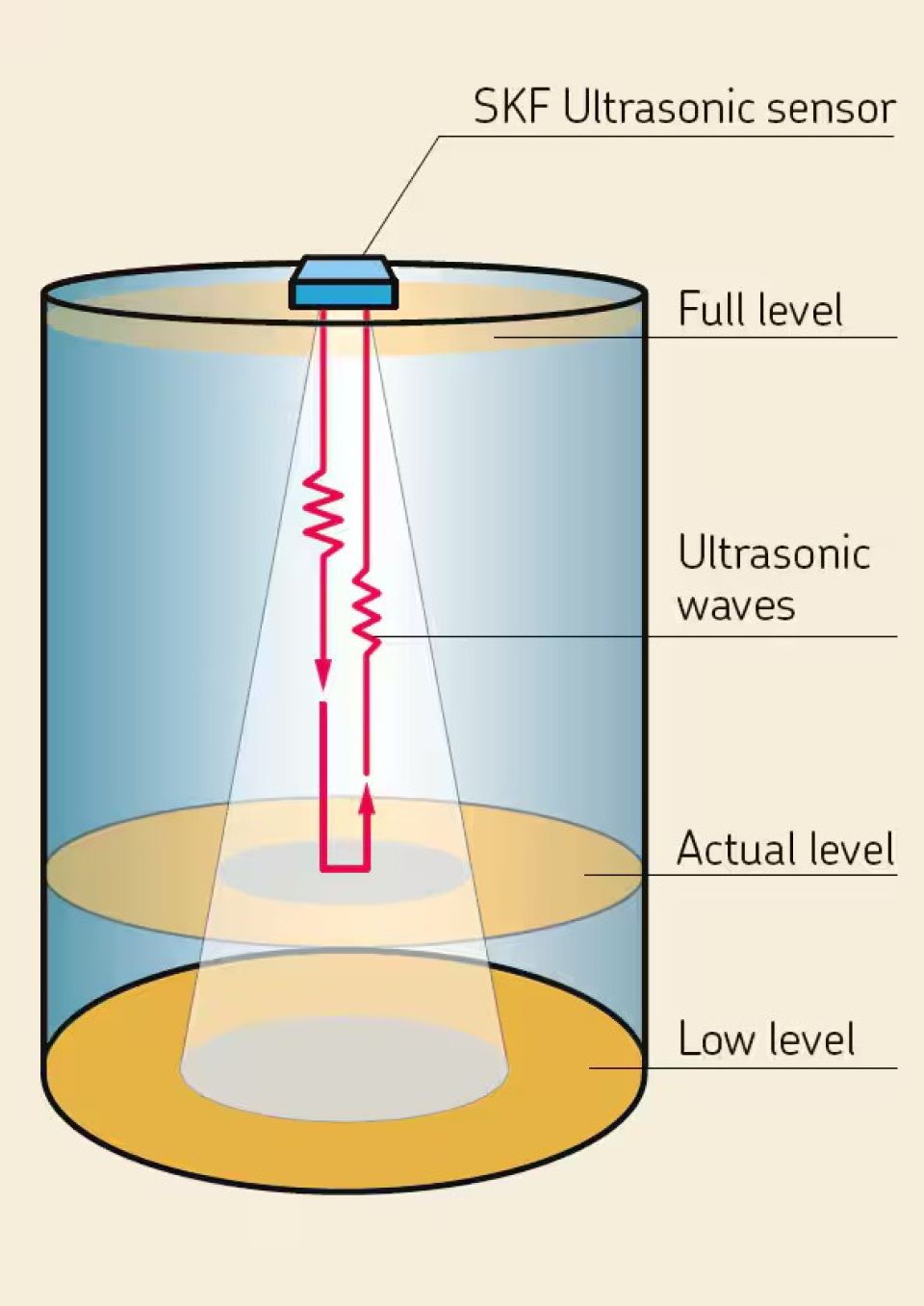 -             Для резервуаров со смазочным материалом объёмом более пяти литровПрактически не требующий техобслуживания датчик SKF использует ультразвуковые волны для бесконтактного измерения расстояния до объекта — поверхности смазочного материала. В зависимости от предварительно заданного диапазона значений выдаётся соответствующий аналоговый сигнал, величина которого пропорциональна расстоянию до смазочного материала. Два цветных светодиодных датчика выполняют индикацию рабочего состояния и аналогового выхода. Технические характеристики и преимущества - Надёжный контроль уровня заполнения резервуара