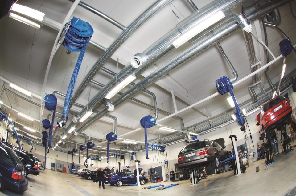 Оптимальное решение для мастерских с большой высотой потолков, где во внимание должно приниматься наличие мостовых кранов или необходимость проезда высокогабаритных автомобилей. Управляется при помощи пульта управления, который может быть подвесным или дистанционным и инфракрасным детектором. Лампочка на катушке показывает режим работы. Электронный датчик предела подъема шланга снижают риск возникновения неисправностей и износа шланга. Включение/выключение вентилятора осуществляется автоматически. В случае потери электро питания электромагнитный тормоз немедленно останавливает барабан. Существует возможность установки вентилятора на катушку.