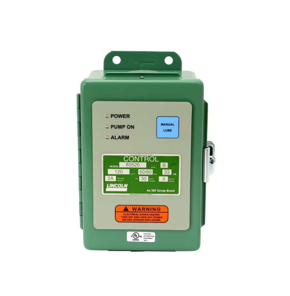 Модель 85525 — это управляемый микропроцессором контроллер с питанием 120 В перем. тока, включающий в себя переключатель давления и монтажные кронштейны. Он полностью программируется и может использоваться как таймер или контроллер. Контроллеры имеют более широкий диапазон нерабочего времени, чем таймеры, и реле памяти для включения/выключения функции предварительного смазывания. Контроллер используется для программирования частоты цикла смазочного насоса. Циклы смазывания определяются установкой внутренних переключателей, а время цикла выбирается в соответствии с требованиями системы. В течение рабочего времени воздух подаётся на электромагнит насоса. Защищённое реле давления обнаруживает рост/падение давления в трубопроводе подачи для подачи сигнала о работе системы в контроллер или систему сигнализации.