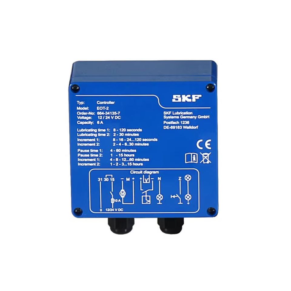 -             Для одномагистральных, многомагистральных и последовательных систем смазыванияУ контроллера EOT-1 предусмотрено фиксированное время работы, равное 4 с, и гибкая регулировка паузы, что делает его пригодным для смазывания цепей. Контроллер EOT-2 имеет гибкие настройки времени. Оба данных контроллера необходимы, если в системах смазывания используются насосы без таймера или если клиент не использует насосы со встроенным контроллером. Они также подходят для модернизации оборудования. Время выставляется с помощью красного (время работы) и синего (время паузы) переключателей, а кнопка используется для включения дополнительного цикла смазывания, что делает насос простым и безопасным в работе. Технические характеристики и преимущества - Простой в использовании контроллер для установки внутри и вне помещений