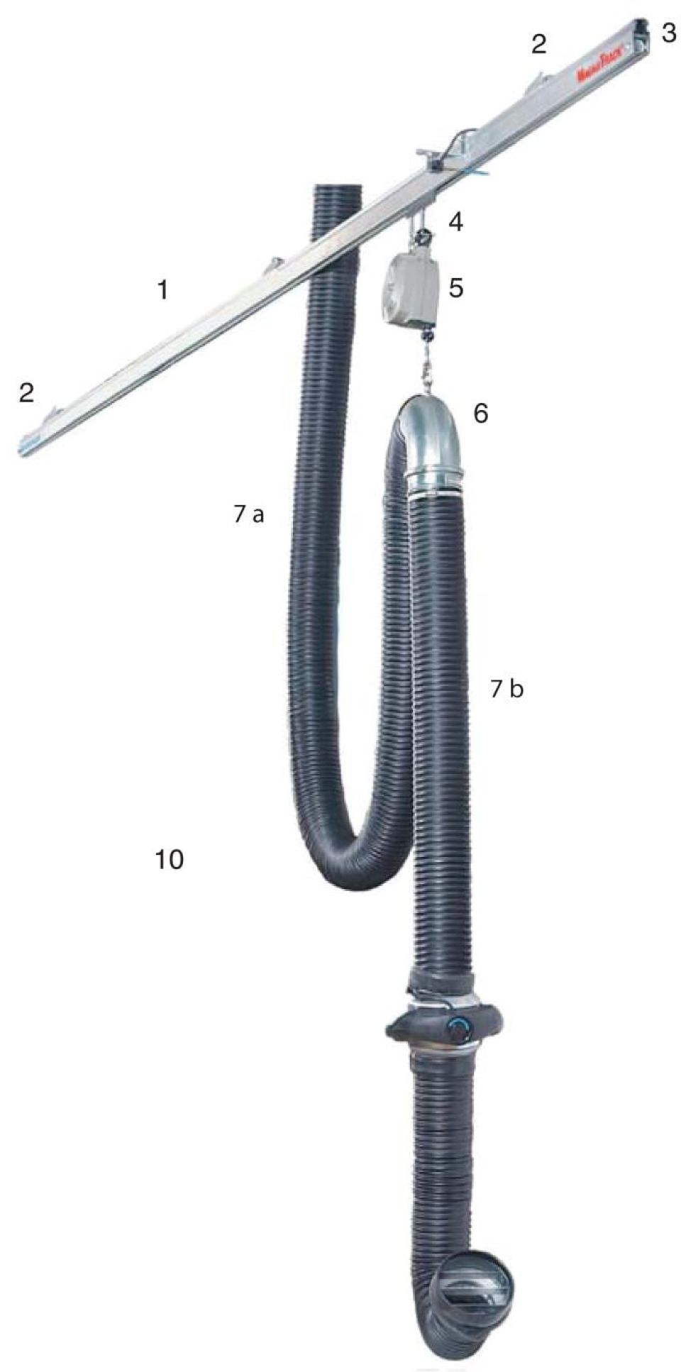 Пояснение к техническим данным | Including — Aluminum track (1), Mounting brackets for 2.4 m distance (2), Rubber stop (3),Sliding block (4), Balancer (5), Swivel (6), Hose connector, Exhaust hose (7), Low level nozzle, length — 0,6 m, diameter — 130 mm (8), Electro-magnet assembly (9), Anchor plate (10) |