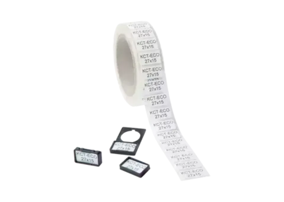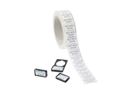 Маркировочные таблички KCT-ECO состоят из композита на основе полиэтилена, нанесенного на прозрачную несущую пленку, на 3-дюймовом сердечнике и могут использоваться для маркировки кнопок вместо табличек из поликарбоната.