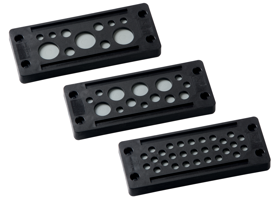 • Плита с кабельными вводами из пластмассы с функцией защелкивания и одной эластомерной пластиной вместо двух