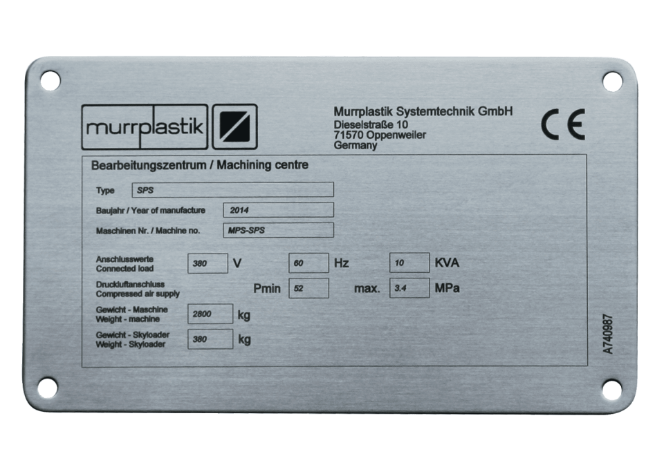 Коррозионно-стойкие таблички из нержавеющей стали V4A для использования в качестве паспортных табличек. Крепление осуществляется с помощью заклепок или винтов.