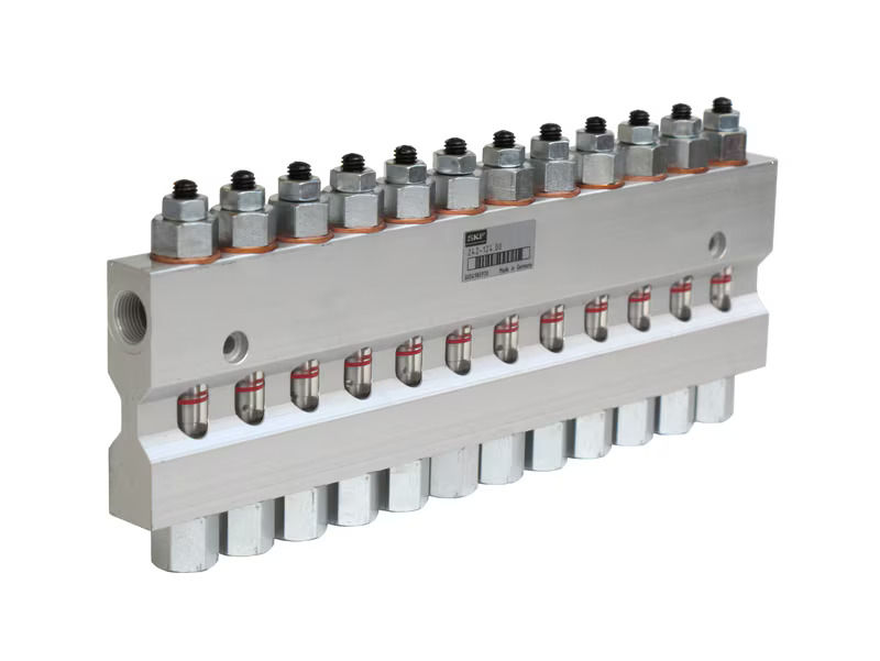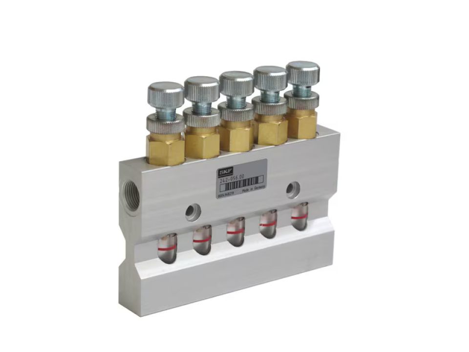 Тип A — значения расхода в диапазоне капельной подачи от 0 до 0,01 л/мин (от 0 до 0,02 пинты). Регулируемый ограничитель 242 оснащается от 1 до 14 выходами и смотровым окном для мониторинга расхода. Тип B предлагает постоянный объём дозирования от 0,01 до 1,0 л/мин (0,02 до 2,11 пинты) и оснащается от 2 до 12 выходами. Тип C — диапазон объёма дозирования от 0,01 до 2,0 л/мин (от 0,02 до 4,23 пинты). В зависимости от распределителя доступны исполнения, оснащённые от 2 до 6 выходами. Устройства типов B и C оснащены подпружиненным металлическим штифтом в смотровом окне для визуального мониторинга расхода масла.