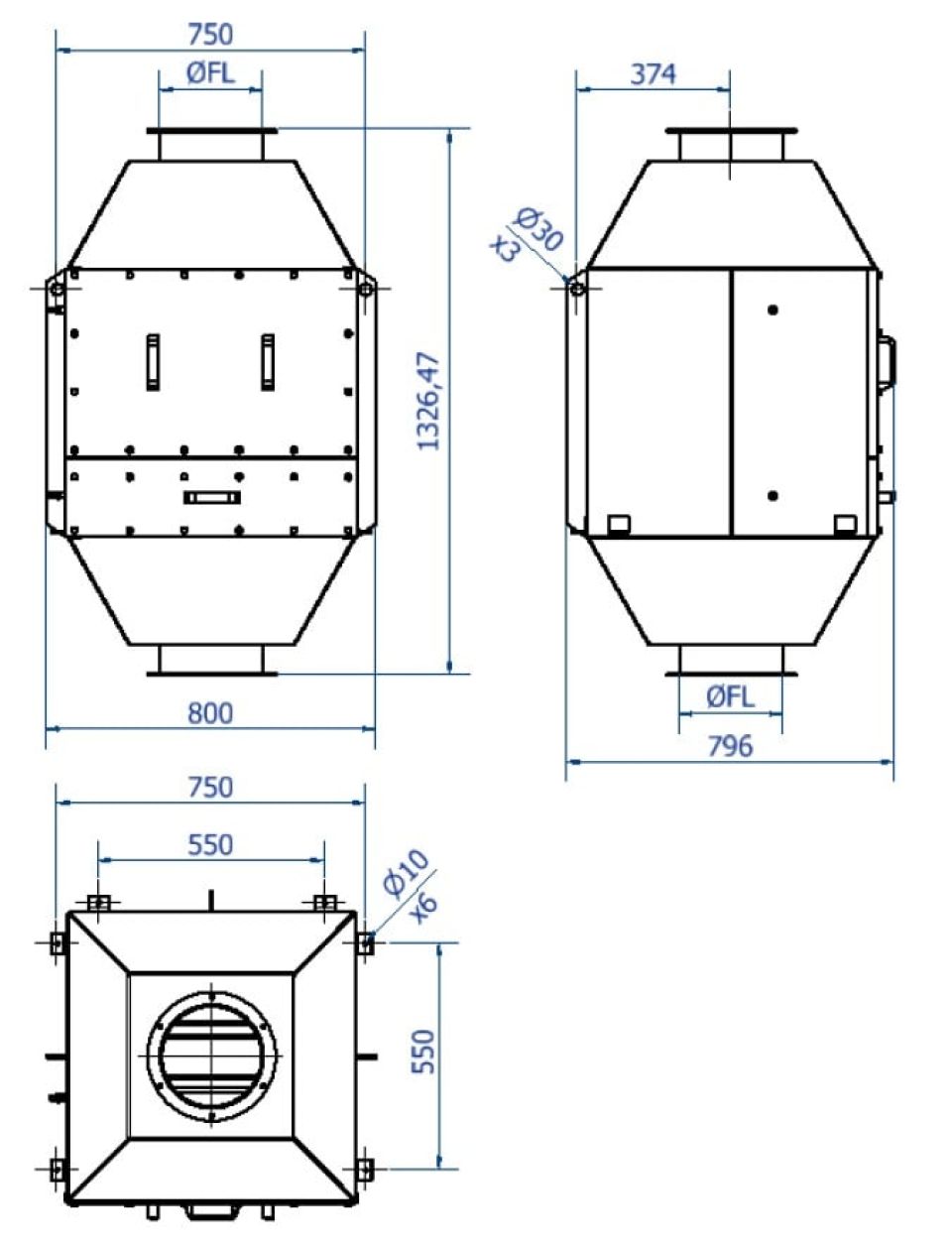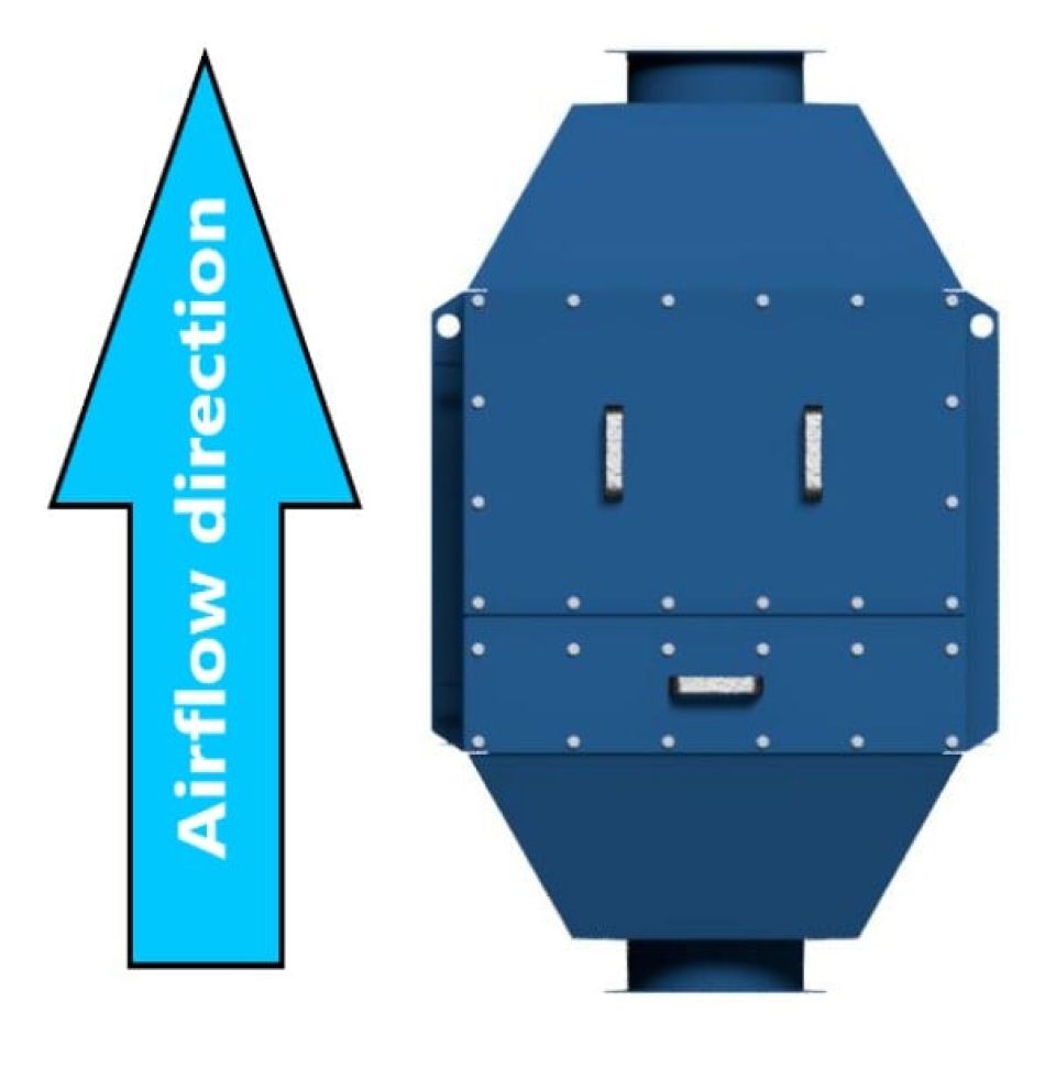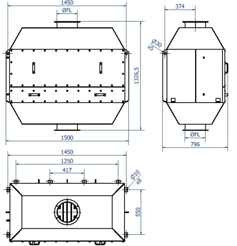 The safety filter is equipped with H13 class filter cartridges according to EN 1822 which are mounted in frames and tightly closed by bolted doors. The flanges are standardized FL flanges.
