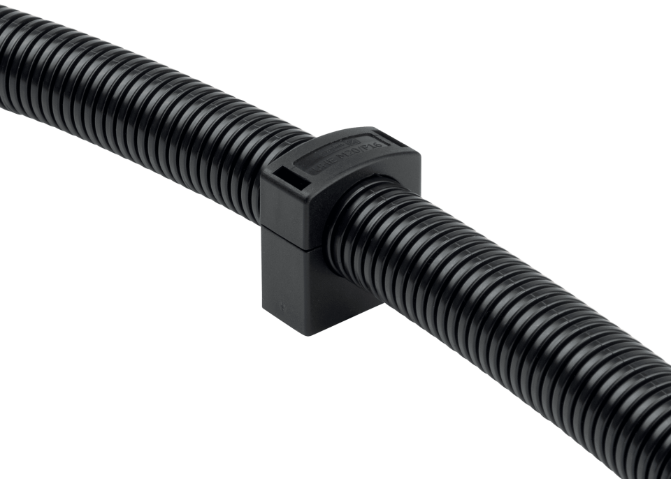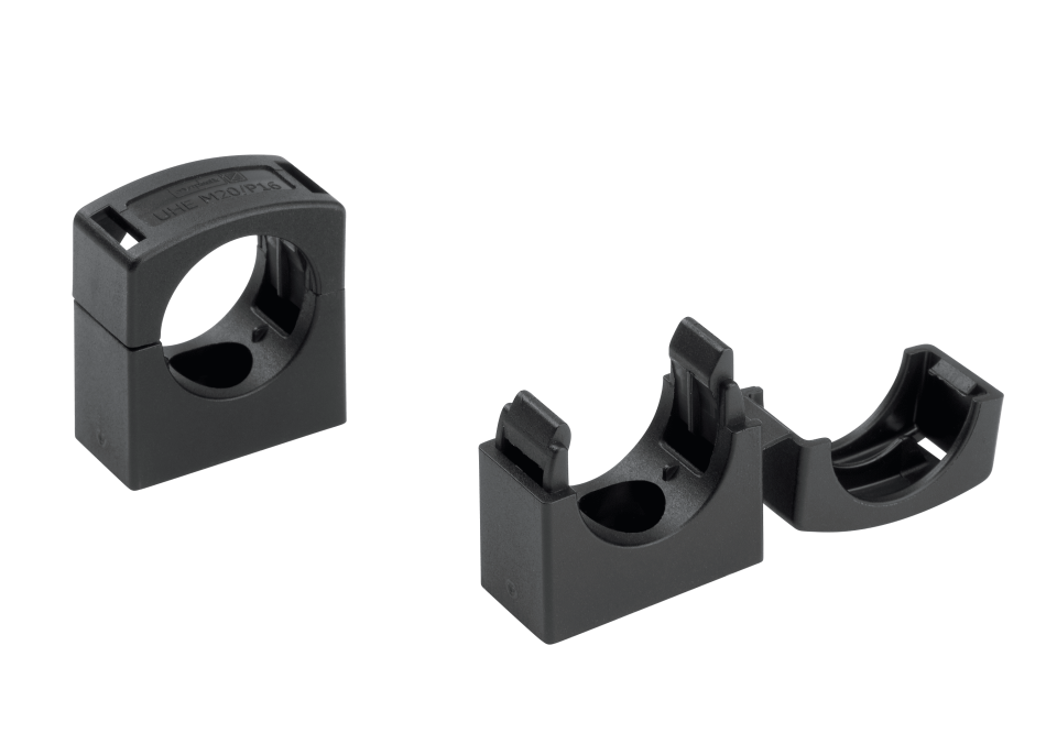 • UHE-держатель представляет собой цельный держатель гофрированной трубы, в котором крышка соединена с держателем пленочной петлей. Он изготовлен из специально модифицированного полиамида. Этот материал не содержит галогенов, фосфора и кадмия. Держатель служит для крепления защитных шлангов для проводов на промышленных установках и машинах.